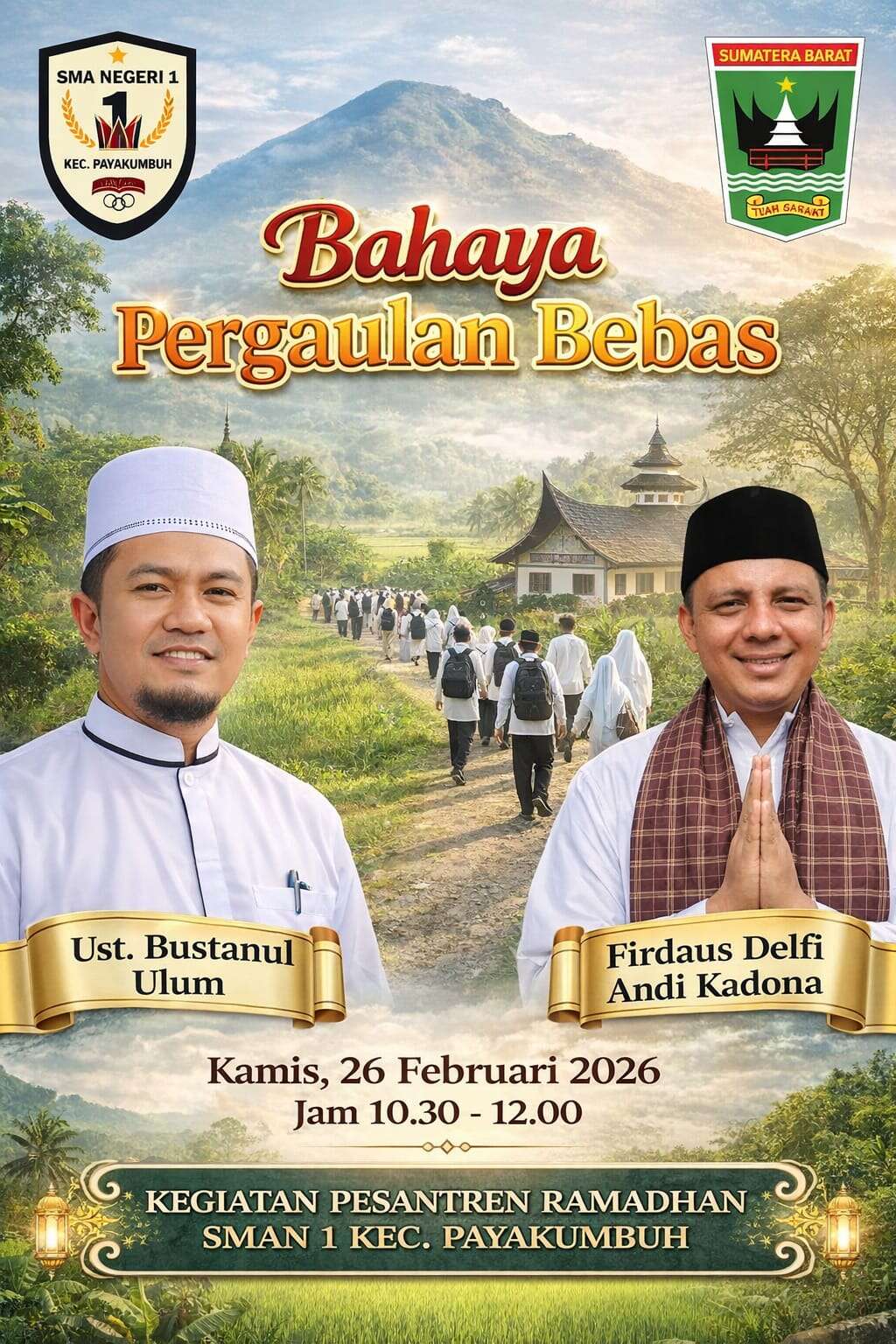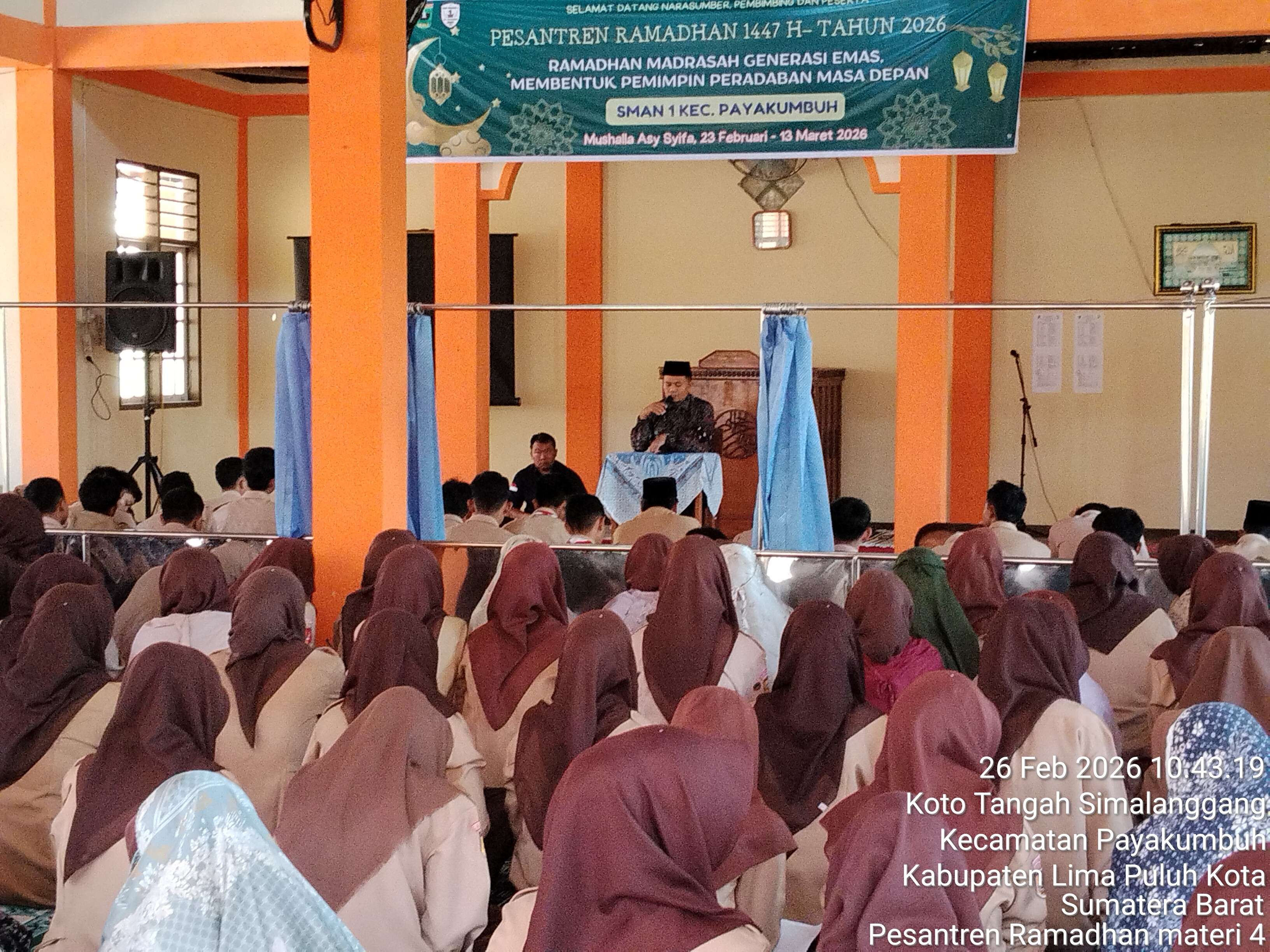 Kegiatan Pesantren Ramadhan hari ke-4 di SMAN 1 Kec. Payakumbuh berlangsung dengan penuh khidmat dan antusiasme dari seluruh peserta didik. Pada kesempatan kali ini, kajian diisi oleh Ustadz Bustanul Ulum yang menyampaikan materi bertema “Bahaya Pergaulan Bebas”.