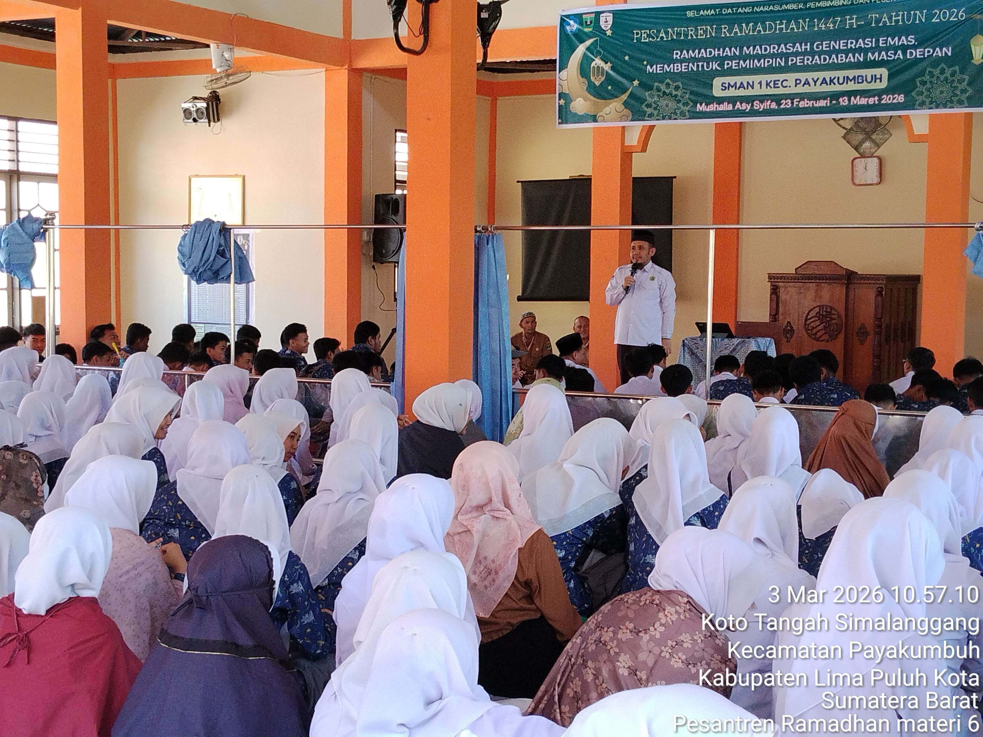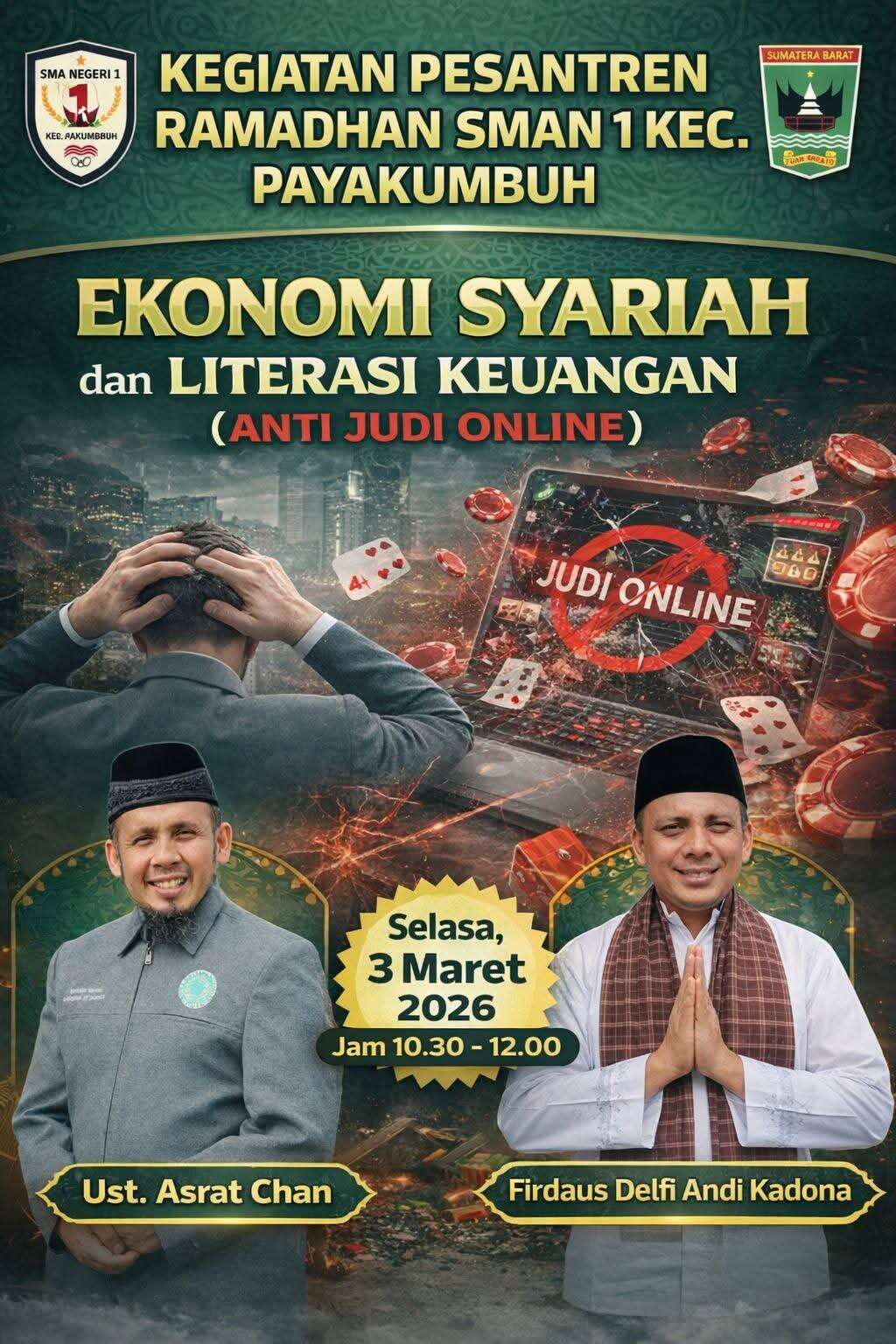 Pesantren Ramadhan di SMAN 1 Kec. Payakumbuh kembali menghadirkan kajian penuh makna pada hari Selasa, 3 Maret 2026, yang bertempat di Mushalla Asy Asyifa. Kegiatan ini menghadirkan Al Ustadz Asrat Chan dengan tema “Ekonomi Syariah dan Literasi Keuangan” serta mengangkat topik penting tentang bahaya judi online.