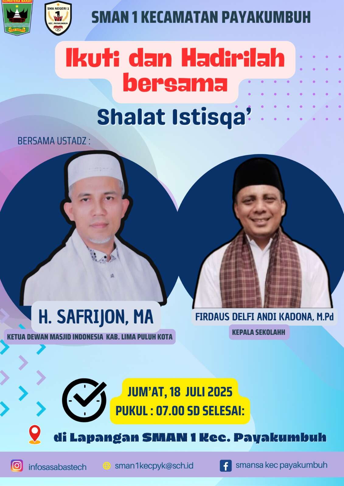 Dalam rangka memohon rahmat Allah SWT agar menurunkan hujan di tengah musim kemarau yang panjang, SMAN 1 Kecamatan Payakumbuh mengajak seluruh warga sekolah — guru, staf, dan siswa-siswi — untuk bersama-sama melaksanakan Sholat Istisqa.