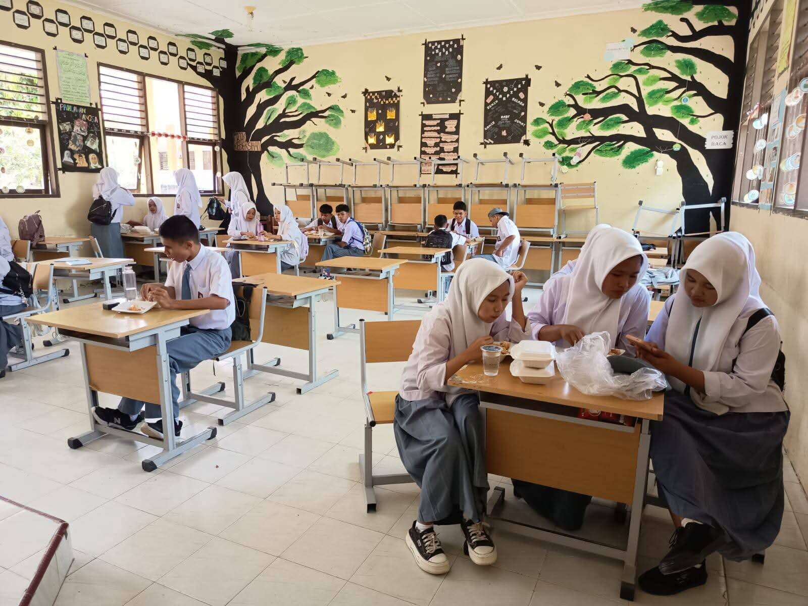 Pesta Kue Lebaran: Meja-meja kelas dipenuhi dengan berbagai stoples kue khas hari raya. Dari nastar hingga kastengel, semua saling berbagi dan mencicipi bekal kue yang dibawa dari rumah.