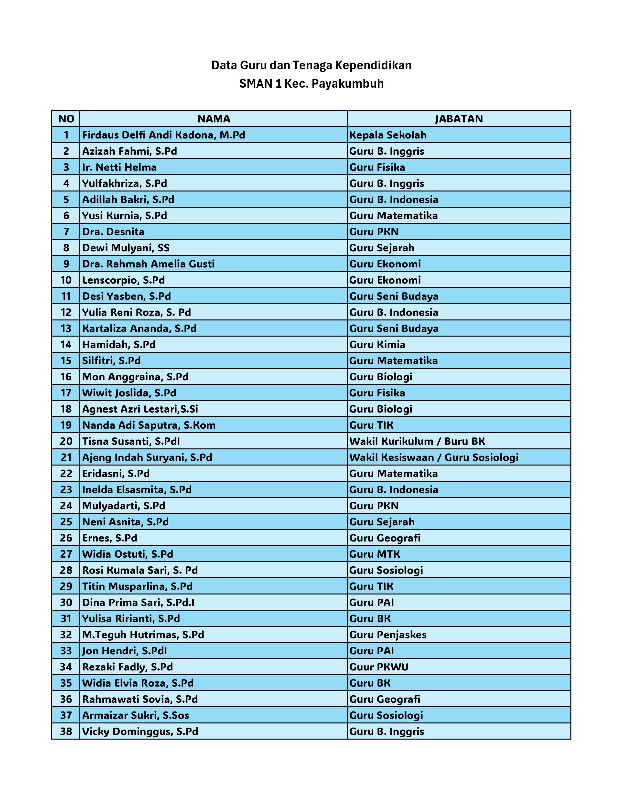 Data Guru dan Tenaga Kependidikan SMAN 1 Kec. Payakumbuh