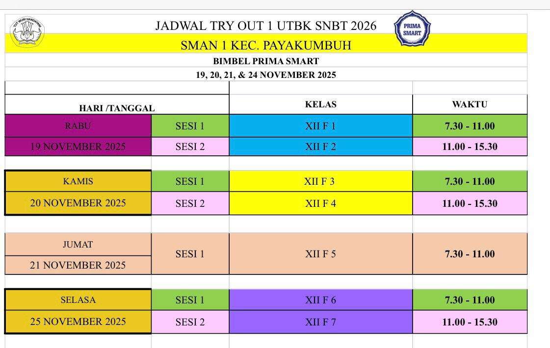 Kepada seluruh calon peserta UTBK, berikut kami sampaikan informasi resmi terkait pelaksanaan Try Out 1 Ujian Tulis Berbasis Komputer (UTBK) SNTB 2026, Demikian informasi ini disampaikan. Harap diperhatikan dan dipersiapkan dengan baik. Panitia UTBK.